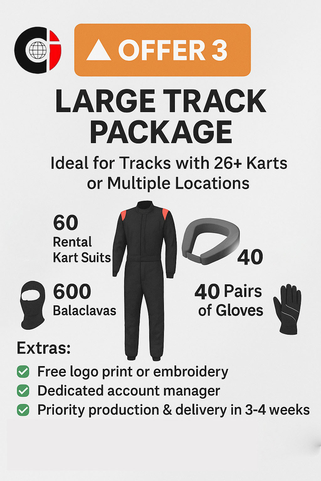 As the demand for recreational karting continues to grow, rental kart tracks must evolve ā with better gear, higher safety standards, and efficient service. Thatās why Cuircon has developed the Large Track Package, tailored specifically for busy tracks running 26 or more karts and handling 80+ daily visitors.