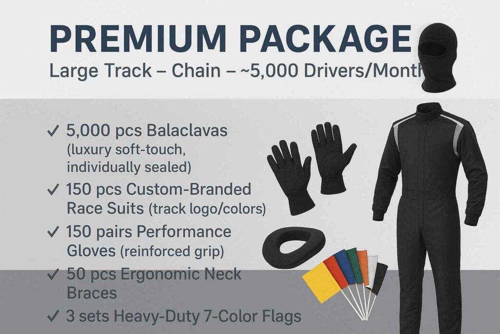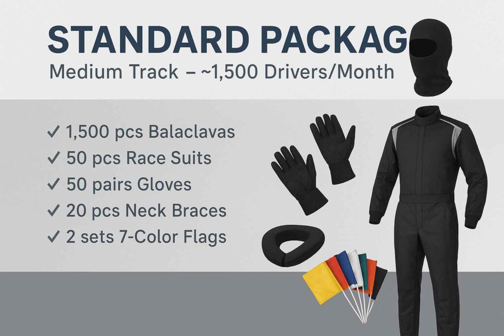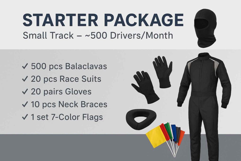 Our Starter Package delivers essential safety gear perfectly suited for smaller go-kart operations. Each kit includes professionally designed balaclavas, race suits, neck braces, and gloves that enhance rider safety while ensuring maximum comfort during races. Ideal for tracks looking to provide a professional experience without a significant investment.